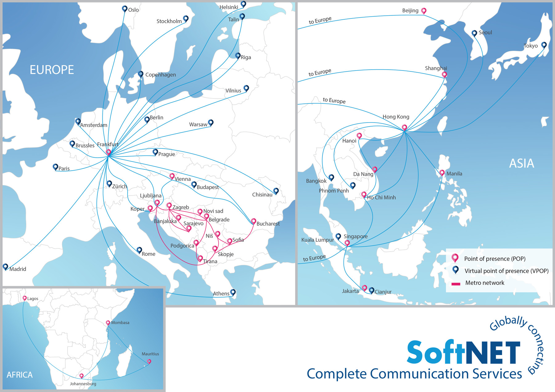 SoftNET je s svojimi vozlišči prisoten v Nemčiji, Avstriji, Sloveniji, na Hrvaškem, v Srbiji, Bosni in Hercegovini, Bolgariji, Romuniji, Makedoniji, Črni gori, Albaniji, na Kitajskem, v Vietnamu, Singapurju, Indoneziji in na Filipinih (v večini od naštetih držav ima tudi pisarne). V sodelovanju s svetovnima omrežjema Sprint in Flag Telecom SoftNET omogoča povezljivost po celem svetu.